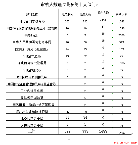 截止到16日8時(shí),通過審核人數(shù)前三位的部門依次是:河北省國家稅務(wù)局、中國銀行業(yè)監(jiān)督管理委員會(huì)河北監(jiān)管局、中央辦公廳,三部門通過審核總?cè)藬?shù)達(dá)1459人,占通過審核總?cè)藬?shù)的98.3%。