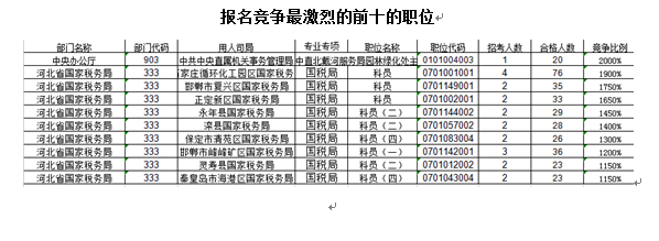 截止到16日8時,競爭比例的職位為中央辦公廳中直北戴河服務局園林綠化處主任科員,招錄1人,截止到16日8時通過人數(shù)為20人,競爭比例2000%,再創(chuàng)河北市競爭比例新高!