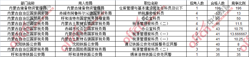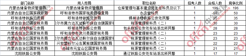 報名通過審核人數(shù)前十的職位主要集中在內(nèi)蒙古儲備物資管理局、赤峰市阿魯科爾沁旗國家稅務(wù)局、呼和浩特市國家稅務(wù)局稽查局等部門,具體信息如下: