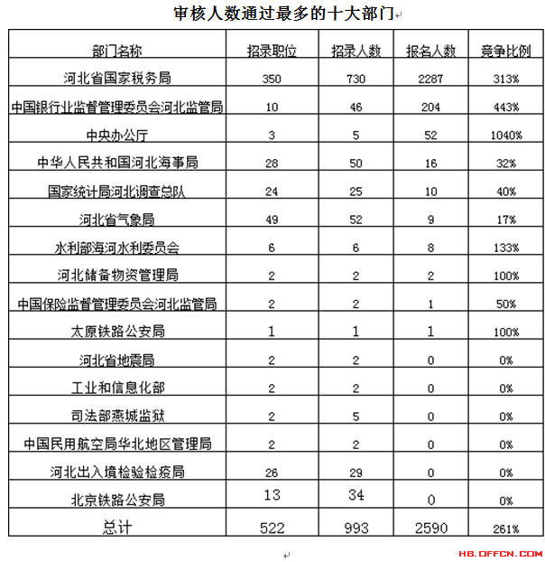 截止到16日16時(shí),通過(guò)審核人數(shù)前三位的部門依次是:河北省國(guó)家稅務(wù)局、中國(guó)銀行業(yè)監(jiān)督管理委員會(huì)河北監(jiān)管局、中央辦公廳,三部門通過(guò)審核總?cè)藬?shù)達(dá)2543人,占通過(guò)審核總?cè)藬?shù)的98.1%。
