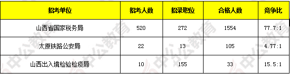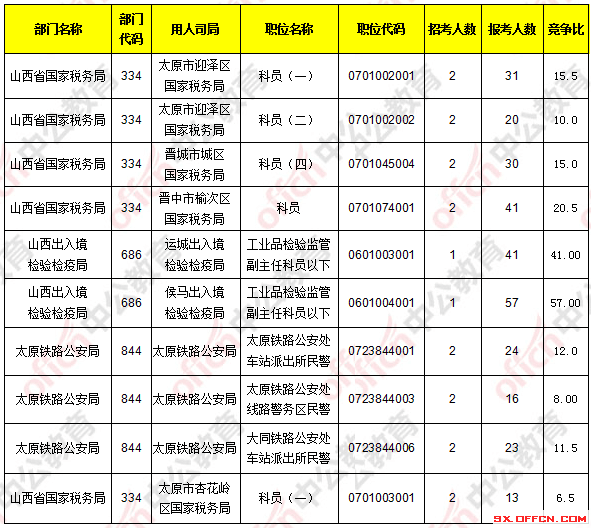 報(bào)考人數(shù)前十位的職位主要集中在山西省國家稅務(wù)局、山西出入境檢驗(yàn)檢疫局、太原鐵路公安等部門,具體信息如下: