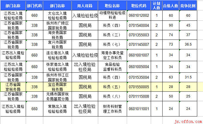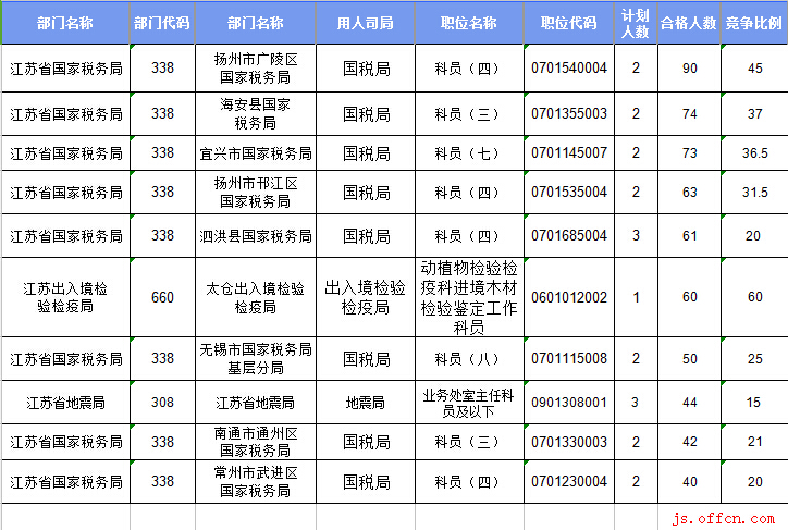 報名通過審核人數(shù)前十的職位主要集中在江蘇省國家稅務(wù)局、江蘇出入境檢驗檢疫局、江蘇省地震局等部門,具體信息如下: