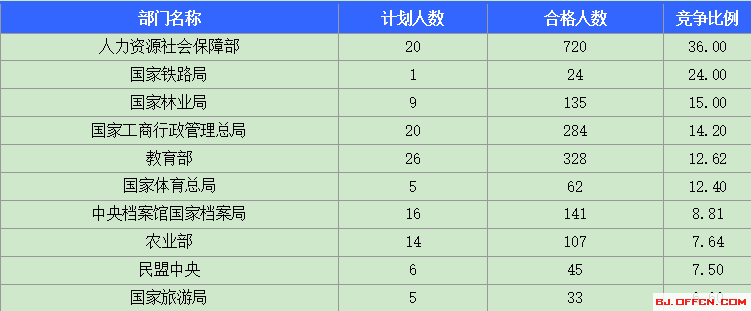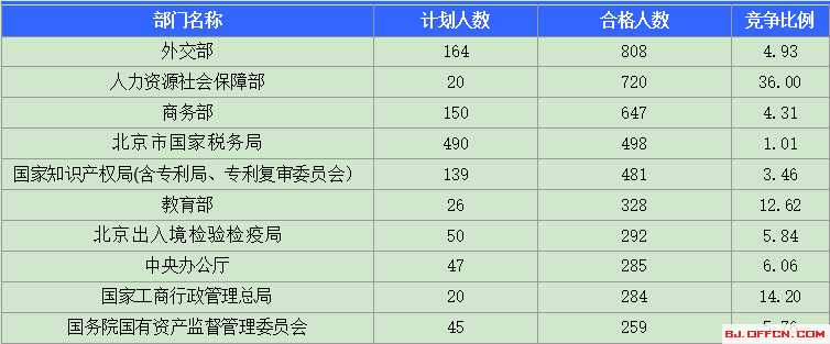 為幫助廣大考生更清晰的了解今日?qǐng)?bào)名情況,北京中公網(wǎng)校整理了合格人數(shù)前十位的部門(mén)以及競(jìng)爭(zhēng)比例最激烈的十大部門(mén),供廣大考生參考: