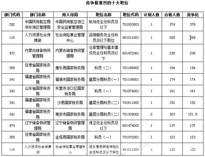 從今日8時(shí)數(shù)據(jù)來(lái)看,競(jìng)爭(zhēng)最激烈的職位為中國(guó)民用航空局華東地區(qū)管理局中國(guó)民用航空浙江安全監(jiān)督管理局機(jī)場(chǎng)處主任科員及以下(職位代碼701003003),競(jìng)爭(zhēng)比379:1。從下表可以看出,目前競(jìng)爭(zhēng)最激烈的十個(gè)職位除了人力資源部一個(gè)職位屬于中央職位以外,其余全部來(lái)自市以下職位,而當(dāng)中有6個(gè)來(lái)自各省國(guó)稅局的職位,2個(gè)職位來(lái)自物資管理系統(tǒng),這也能看出考生對(duì)于這兩個(gè)系統(tǒng)的喜愛(ài)。從職位條件來(lái)看,這十個(gè)職位對(duì)于基層工作經(jīng)驗(yàn)全部沒(méi)有要求,尤其可見(jiàn),這一條件對(duì)于大部分應(yīng)屆生來(lái)說(shuō)是一個(gè)門檻,作為國(guó)考報(bào)考的主力大軍來(lái)說(shuō),中公網(wǎng)校專家建議,廣大應(yīng)屆生應(yīng)該更多關(guān)注基層職位,很多基層職位也是很好的選擇。