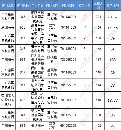報(bào)名通過(guò)審核人數(shù)前十的職位主要集中在廣州海關(guān)、廣東出入境檢驗(yàn)檢疫局、深圳出入境檢驗(yàn)檢疫局等部門,具體信息如下: