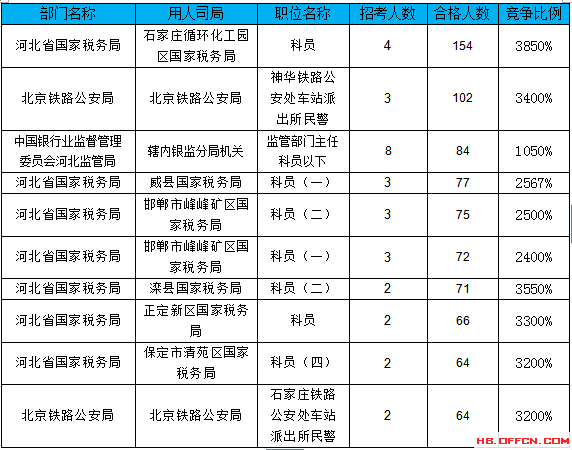 報名通過審核人數(shù)前十的職位主要集中在河北省國家稅務(wù)局、中國銀行業(yè)監(jiān)督管理委員會河北監(jiān)管局、北京鐵路公安局等部門,具體信息如下:
