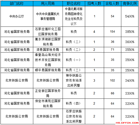截止到17日16時,競爭比例的職位為中央辦公廳中直北戴河服務(wù)局園林綠化處主任科員及以下一職,招錄1人,截止到17日16時通過人數(shù)為54人。