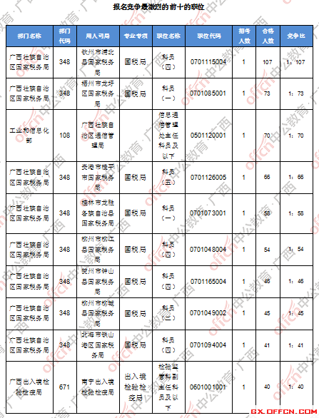 截止到17日16時,競爭比例的職位為欽州市浦北縣國家稅務(wù)局(四)一職,招錄1人,通過人數(shù)為107人,競爭比例107:1!
