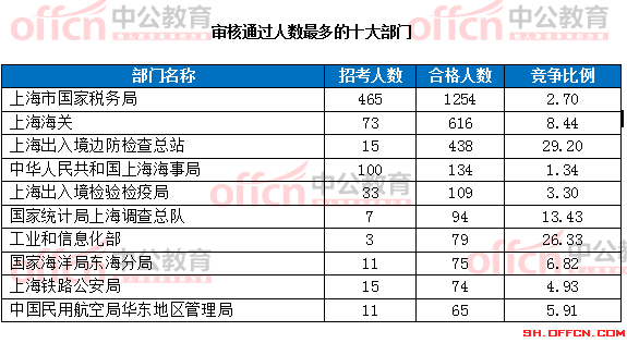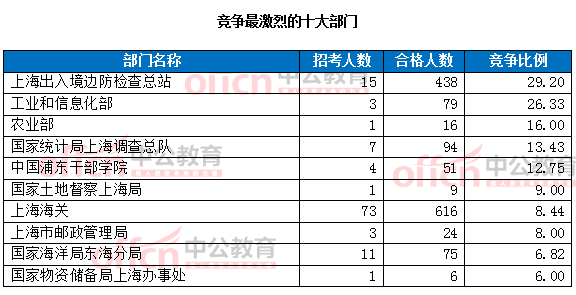 為幫助廣大考生更清晰的了解今日?qǐng)?bào)名情況,上海中公教育整理了審核通過(guò)人數(shù)前十位的部門(mén)以及競(jìng)爭(zhēng)比例最激烈的十大部門(mén),供廣大考生參考: