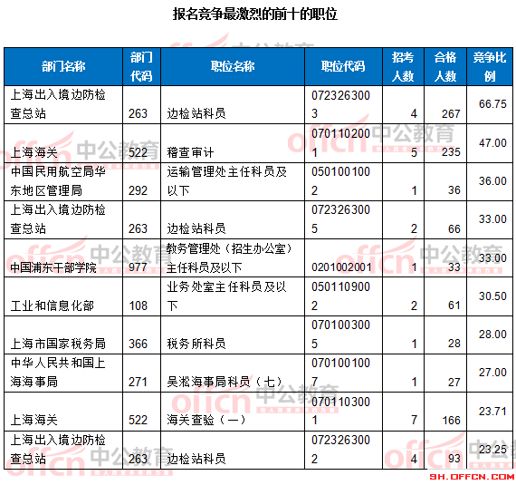 報(bào)名通過(guò)審核人數(shù)前十的職位主要集中在上海出入境邊防檢查總站、上海海關(guān)、工業(yè)和信息化部,具體信息如下: