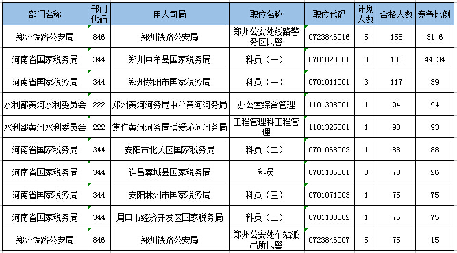 報(bào)名通過(guò)審核人數(shù)排名前列的職位主要集中在鄭州鐵路公安局、河南省國(guó)家稅務(wù)局,水利部黃河水利委員會(huì),具體信息如下: