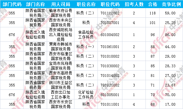 報名通過審核人數(shù)前十的職位主要集中在陜西省國家稅務(wù)局及陜西出入境檢驗檢疫局兩大部門,具體信息如下: