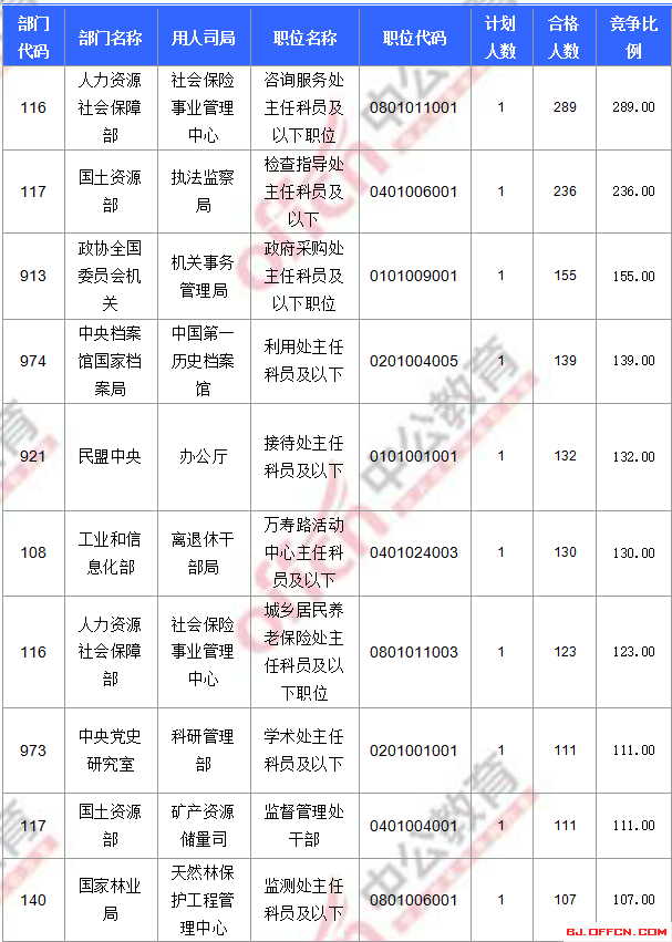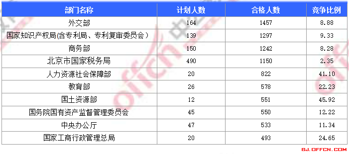 為幫助廣大考生更清晰的了解今日?qǐng)?bào)名情況,北京中公網(wǎng)校整理了合格人數(shù)前十位的部門以及競(jìng)爭(zhēng)比例最激烈的十大部門,供廣大考生參考:
