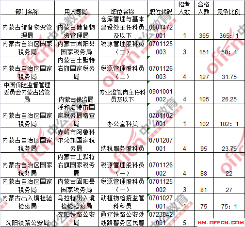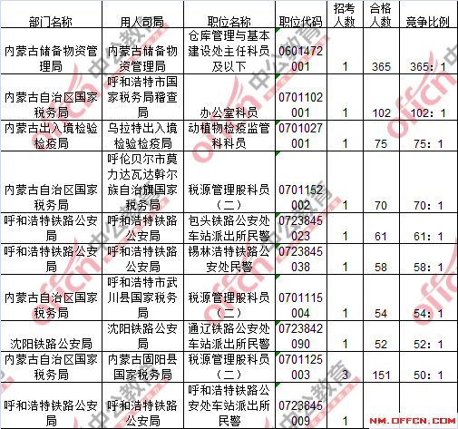 報(bào)名通過審核人數(shù)前十的職位主要集中在內(nèi)蒙古儲(chǔ)備物資管理局、內(nèi)蒙古固陽縣國家稅務(wù)局、內(nèi)蒙古土默特右旗國家稅務(wù)局等部門,具體信息如下: