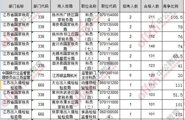 報名通過審核人數(shù)前十的職位主要集中在江蘇省國家稅務(wù)局、中國銀行業(yè)監(jiān)督管理委員會江蘇監(jiān)管局、江蘇出入境檢驗檢疫局,具體信息如下: