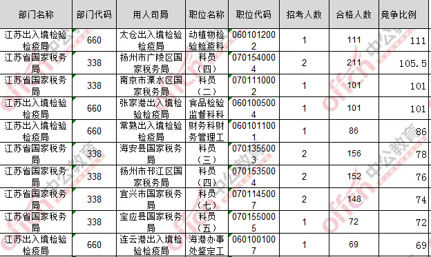 截止到18日8時,競爭比例的職位為江蘇出入境檢驗檢疫局太倉出入境檢驗檢疫局動植物檢驗檢疫科進(jìn)境木材檢驗鑒定工作科員一職,招錄1人,截止到17日16時通過人數(shù)為111人。