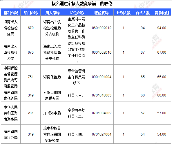 截止到18日8時,已有154個職位破0,且熱門職位人數(shù)競爭已經(jīng)開始激烈,其中報名人數(shù)最多的職位為:海南出入境檢驗檢疫局,金屬材料及化工產(chǎn)品檢驗監(jiān)管工作副主任科員,共報名94人,競爭比例已高達94:1!