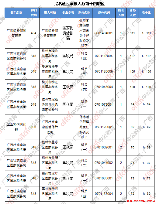 報(bào)名通過審核人數(shù)前十的職位主要集中在廣西儲(chǔ)備物資管理局、廣西壯族自治區(qū)國家稅務(wù)局、工業(yè)和信息化部等部門,具體信息如下: