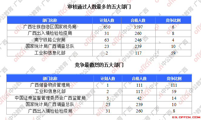 為幫助廣大考生更清晰的了解今日?qǐng)?bào)名情況,廣西中公網(wǎng)校整理了審核通過人數(shù)前五位的部門以及競爭比例最激烈的五大部門,供廣大考生參考: