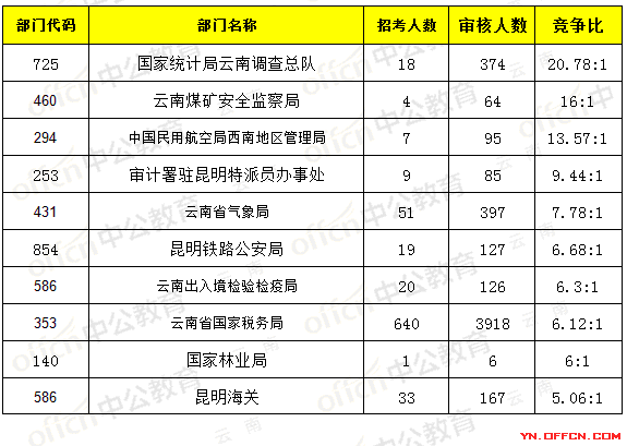 報(bào)名通過(guò)審核人數(shù)前十的職位主要集中在云南省氣象局、國(guó)家統(tǒng)計(jì)局云南調(diào)查總隊(duì),具體信息如下: