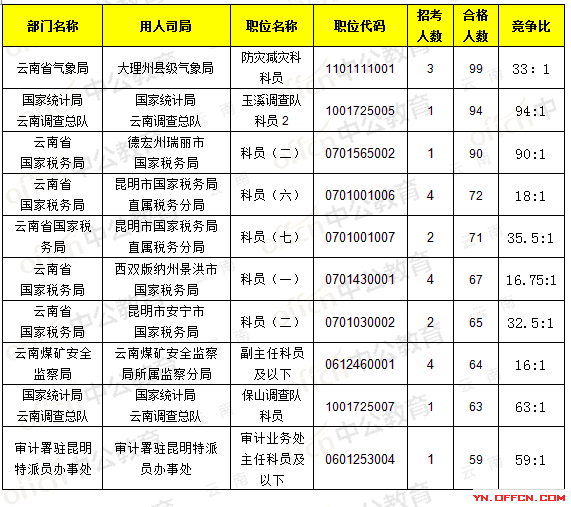 截止18日8時(shí),招錄比例的職位為云南省氣象局,職位代碼是1101111001,招錄3人,通過(guò)人數(shù)99人,競(jìng)爭(zhēng)比33:1 。