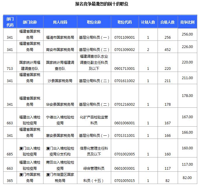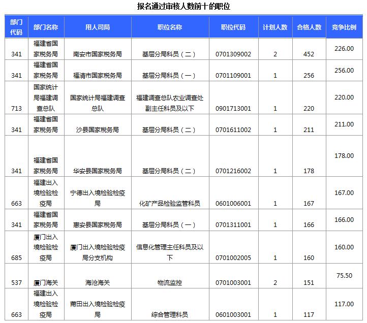 報(bào)名通過審核人數(shù)前十的職位主要集中在南安市國家稅務(wù)局、福清市國家稅務(wù)局、國家統(tǒng)計(jì)局福建調(diào)查總隊(duì)等部門,具體信息如下: