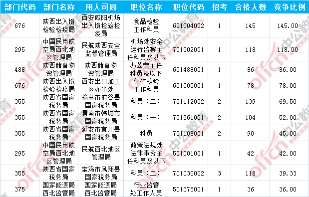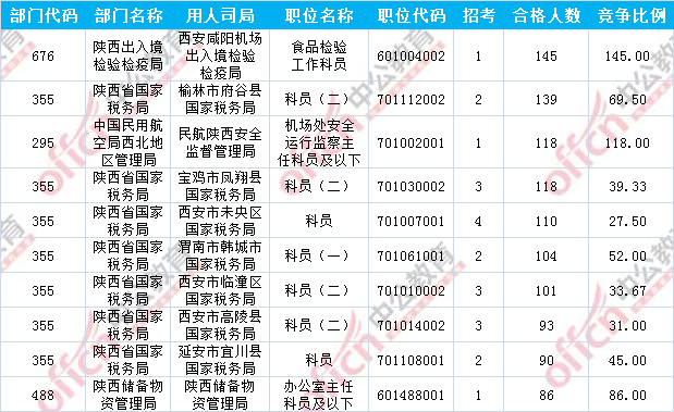 報名通過審核人數(shù)前十的職位主要集中在陜西出入境檢驗檢疫局、陜西省國家稅務(wù)局、中國民用航空局西北地區(qū)管理局等部門,具體信息如下:中公提供數(shù)據(jù)
