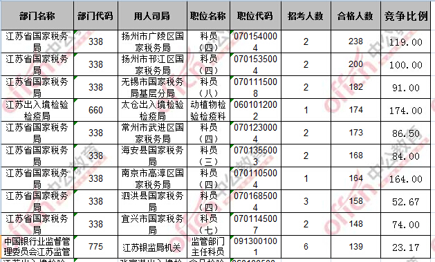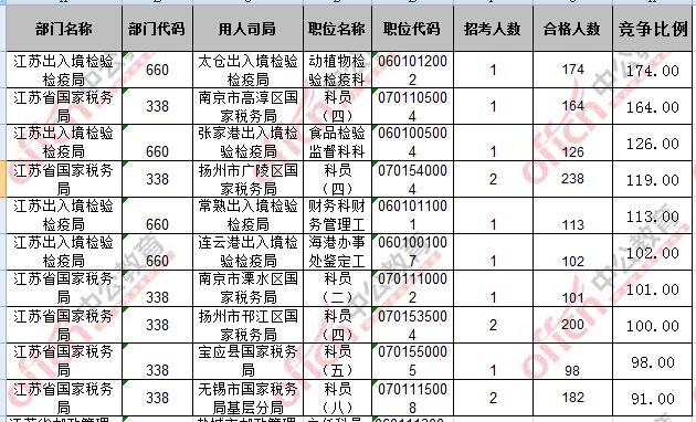 截止到18日16時(shí),競(jìng)爭(zhēng)比例的職位為江蘇出入境檢驗(yàn)檢疫局太倉(cāng)出入境檢驗(yàn)檢疫局動(dòng)植物檢驗(yàn)檢疫科進(jìn)境木材檢驗(yàn)鑒定工作科員一職,招錄1人,截止到18日16時(shí)通過人數(shù)為174人。