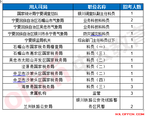 截止到18日16時,工作地點在寧夏的職位共有14個無人報考,占全部職位的12%。下面是無人報考職位一覽表,中公網校專家建議廣大考生多關注一些較冷職位,避免激烈競爭,結合自身條件,找到屬于自己的職位。