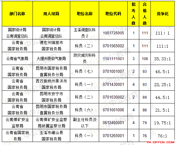 報名通過審核人數(shù)前十的職位主要集中在國家統(tǒng)計局云南調(diào)查總隊、云南省國家稅務局、云南煤礦安全監(jiān)察局等部門,具體信息如下: