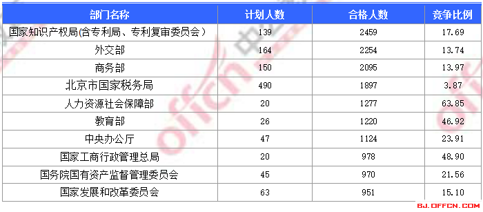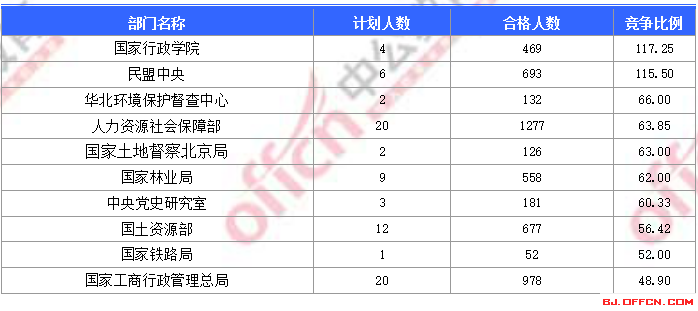 為幫助廣大考生更清晰的了解今日?qǐng)?bào)名情況,北京中公網(wǎng)校整理了合格人數(shù)前十位的部門以及競(jìng)爭(zhēng)比例最激烈的十大部門,供廣大考生參考: