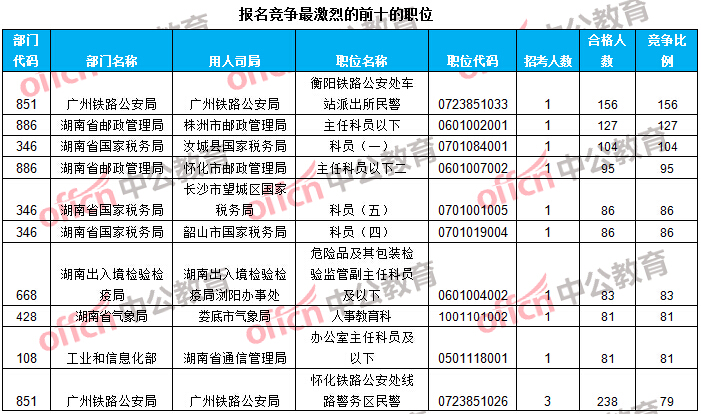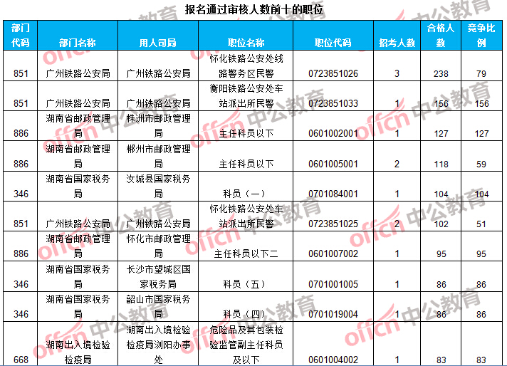 報(bào)名通過審核人數(shù)前十的職位主要集中在廣州鐵路公安局、湖南省郵政管理局和湖南省國家稅務(wù)局等部門,具體信息如下: