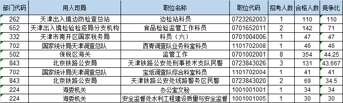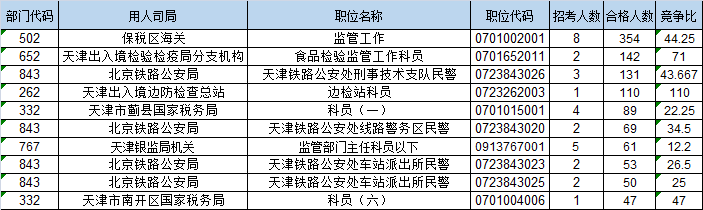 報(bào)名通過(guò)審核人數(shù)前十的職位主要集中在保稅區(qū)海關(guān)、天津出入境檢驗(yàn)檢疫局分支機(jī)構(gòu)、北京鐵路公安局,具體信息如下: