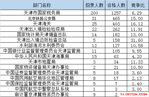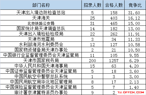 為幫助廣大考生更清晰的了解今日?qǐng)?bào)名情況,天津中公網(wǎng)校整理了審核通過(guò)人數(shù)前五位的部門以及競(jìng)爭(zhēng)比例最激烈的五大部門,供廣大考生參考: