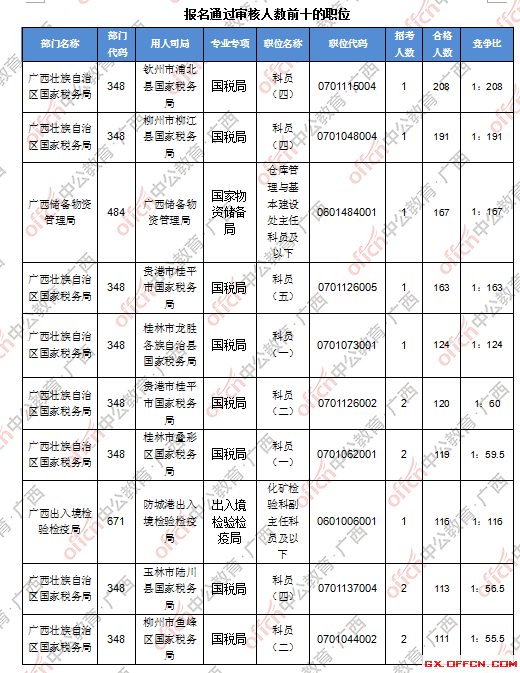 報名通過審核人數前十的職位主要集中在廣西壯族自治區(qū)國家稅務局、廣西儲備物資管理局、廣西出入境檢驗檢疫局等部門,具體信息如下: