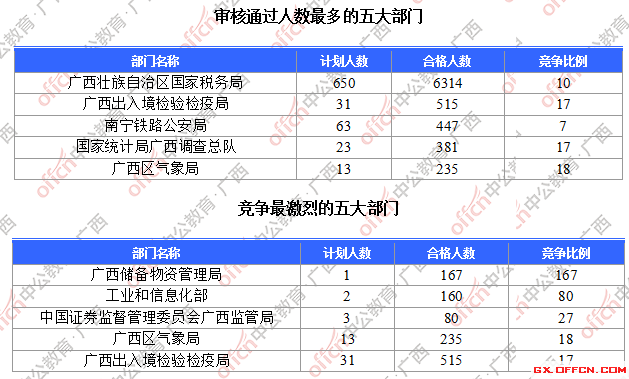 為幫助廣大考生更清晰的了解今日報名情況,廣西中公網校整理了審核通過人數前五位的部門以及競爭比例最激烈的五大部門,供廣大考生參考: