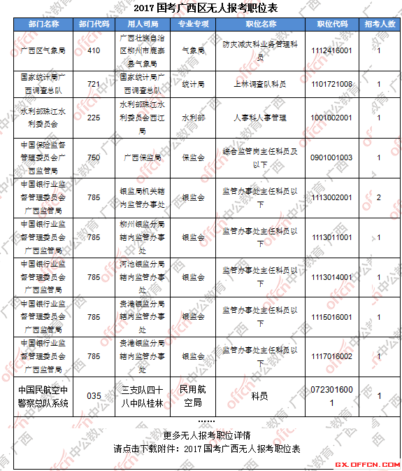 截止到19日8時(shí),工作地點(diǎn)在廣西的職位共有66個(gè)無(wú)人報(bào)考,占全部職位的10.3%。下面是部分廣西無(wú)人報(bào)考職位一覽表,更多無(wú)人報(bào)考職位詳情請(qǐng)下載附件,廣西中公網(wǎng)校專家建議廣大考生結(jié)合自身?xiàng)l件,根據(jù)自己的實(shí)際情況找到屬于自己的職位,避免激烈競(jìng)爭(zhēng)。