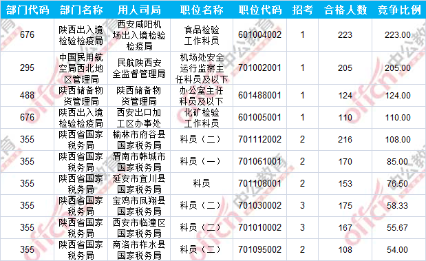 報名通過審核人數(shù)前十的職位主要集中在陜西出入境檢驗檢疫局、陜西省國家稅務局、中國民用航空局西北地區(qū)管理局等部門,具體信息如下:
