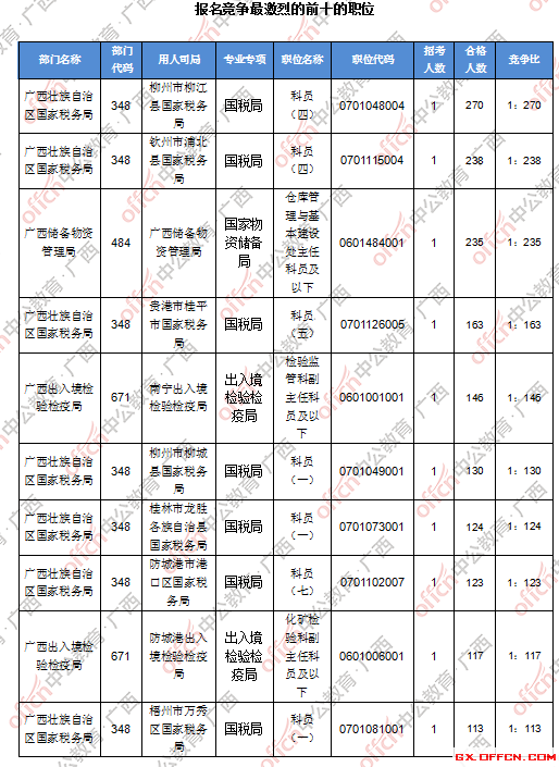 報名通過審核人數(shù)前十的職位主要集中在廣西壯族自治區(qū)國家稅務(wù)局、廣西儲備物資管理局、廣西出入境檢驗檢疫局等部門,具體信息如下:
