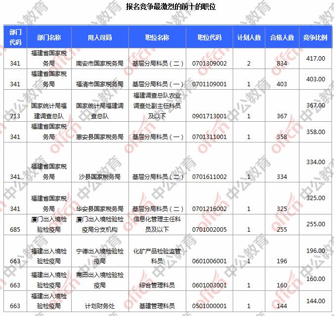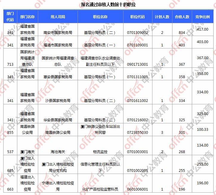 報名通過審核人數(shù)前十的職位主要集中在南安市國家稅務局、福清市國家稅務局、國家統(tǒng)計局福建調(diào)查總隊等部門,具體信息如下: