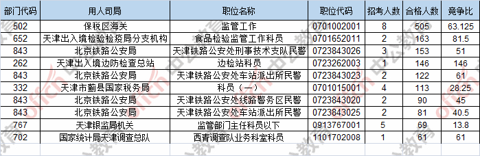 報名通過審核人數(shù)前十的職位主要集中在保稅區(qū)海關(guān)、天津出入境檢驗檢疫局分支機構(gòu)、北京鐵路公安局,具體信息如下: