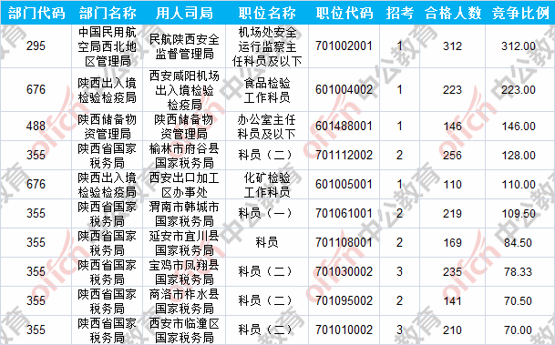 報名通過審核人數(shù)前十的職位主要集中在陜西出入境檢驗檢疫局、陜西省國家稅務(wù)局、中國民用航空局西北地區(qū)管理局等部門,具體信息如下: