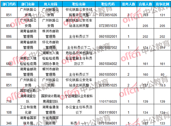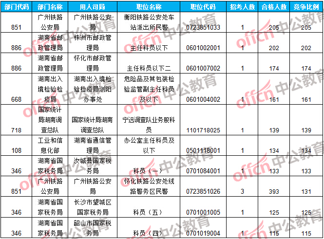 報(bào)名通過審核人數(shù)前十的職位主要集中在廣州鐵路公安局、湖南省郵政管理局等部門,具體信息如下: