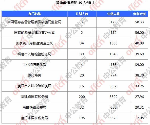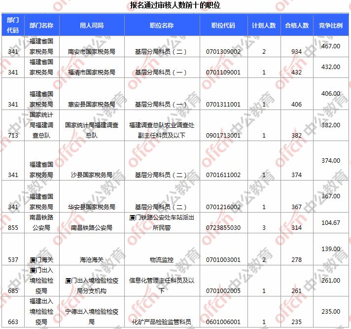 為幫助廣大考生更清晰的了解今日報名情況,福建中公網(wǎng)校整理了審核通過人數(shù)前10位的部門以及競爭比例最激烈的10大部門,供廣大考生參考: