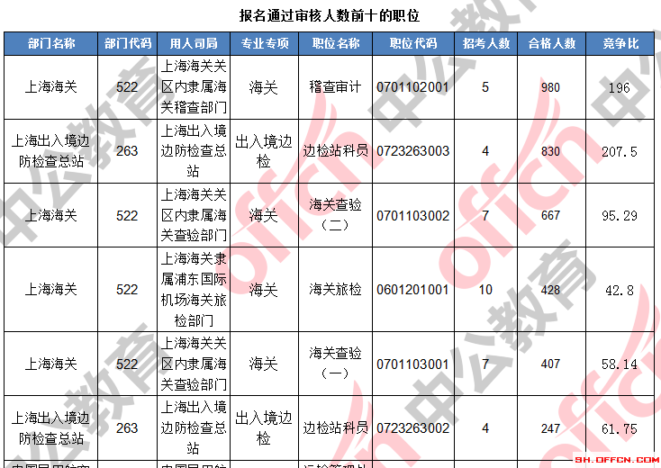 報名通過審核人數(shù)前十的職位主要集中在上海出上海海關(guān)、上海出入境邊防檢查總站、中國民用航空局華東地區(qū)管理局,具體信息如下: