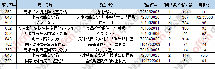 報(bào)名通過審核人數(shù)前十的職位主要集中在保稅區(qū)海關(guān)、北京鐵路公安局、天津出入境邊防檢查總站,具體信息如下: