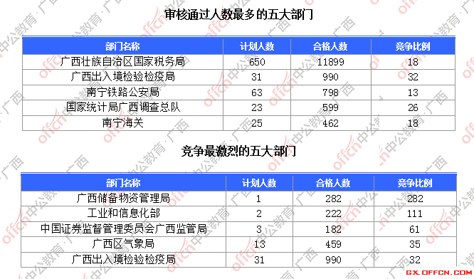 為幫助廣大考生更清晰的了解今日報名情況,廣西中公網(wǎng)校整理了審核通過人數(shù)前五位的部門以及競爭比例最激烈的五大部門,供廣大考生參考: