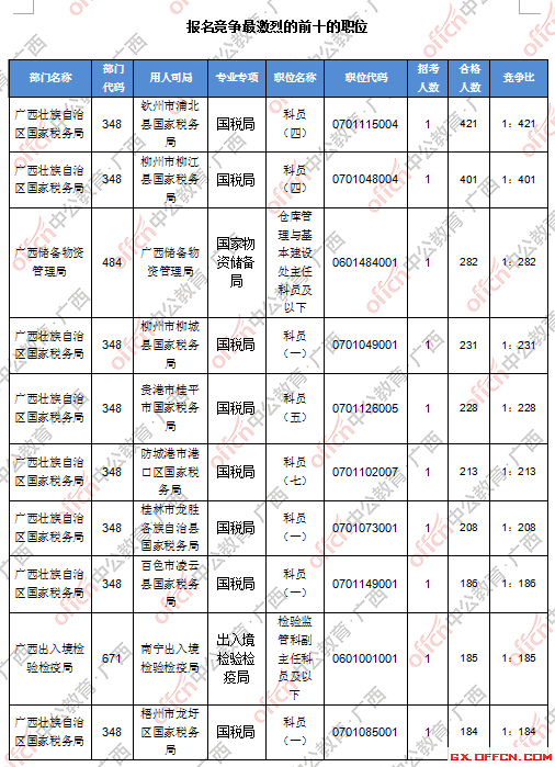 截止到21日8時,競爭比例的職位為欽州市浦北縣國家稅務(wù)局科員(四)一職,招錄1人,通過人數(shù)為421人,競爭比例421:1。