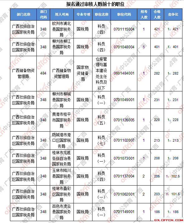 報名通過審核人數(shù)前十的職位主要集中在廣西壯族自治區(qū)國家稅務(wù)局、廣西儲備物資管理局等部門,具體信息如下:
