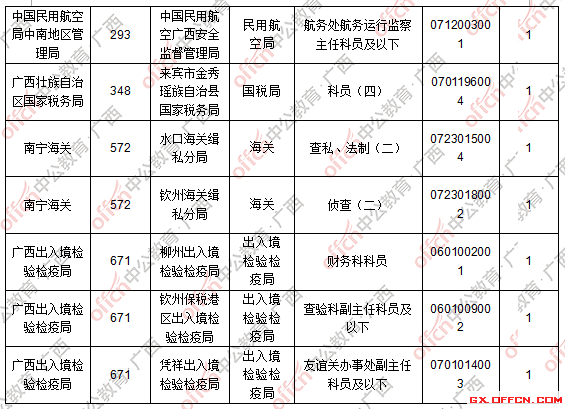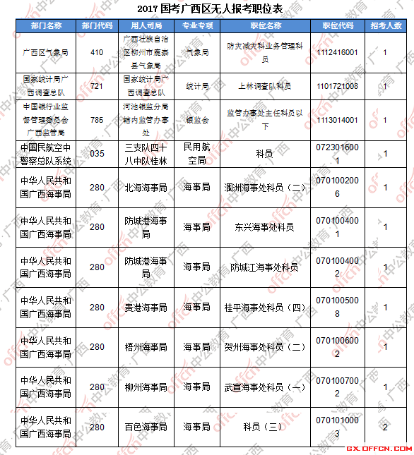 截止到21日16時(shí),工作地點(diǎn)在廣西的職位共有18個(gè)無(wú)人報(bào)考,占全部職位的2.8%。下面是部分廣西無(wú)人報(bào)考職位一覽表,廣西中公網(wǎng)校專(zhuān)家建議廣大考生結(jié)合自身?xiàng)l件,根據(jù)自己的實(shí)際情況找到屬于自己的職位,避免激烈競(jìng)爭(zhēng)。